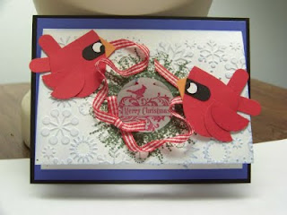 Here are some cards made with the note cards and some punched cardinals. The cardinals are made from the wide oval punch the square punch and a 1/4' circle and a 1 " circle and the word window punches. They are fun to make. The weath was made from taking one of the pocket Silhouette stamps and moving them around a punched circle. I put a sticky note in the center to keep from stamping the inside of the note card. I love the gingham red ribbon. Just twirled it on and attached with mini glue dots. The Greeting in the center is from a hostess set called Holiday Best. It is available to anyone placing a single $150 order along with that you also get $15 stamping reward dollars to spend on anything in the catalog. There is also a special on this month host a workshop of $250 in sales and get an item from the Holiday Mini for $10. That includes the bigshot pop up Christmas tree die.